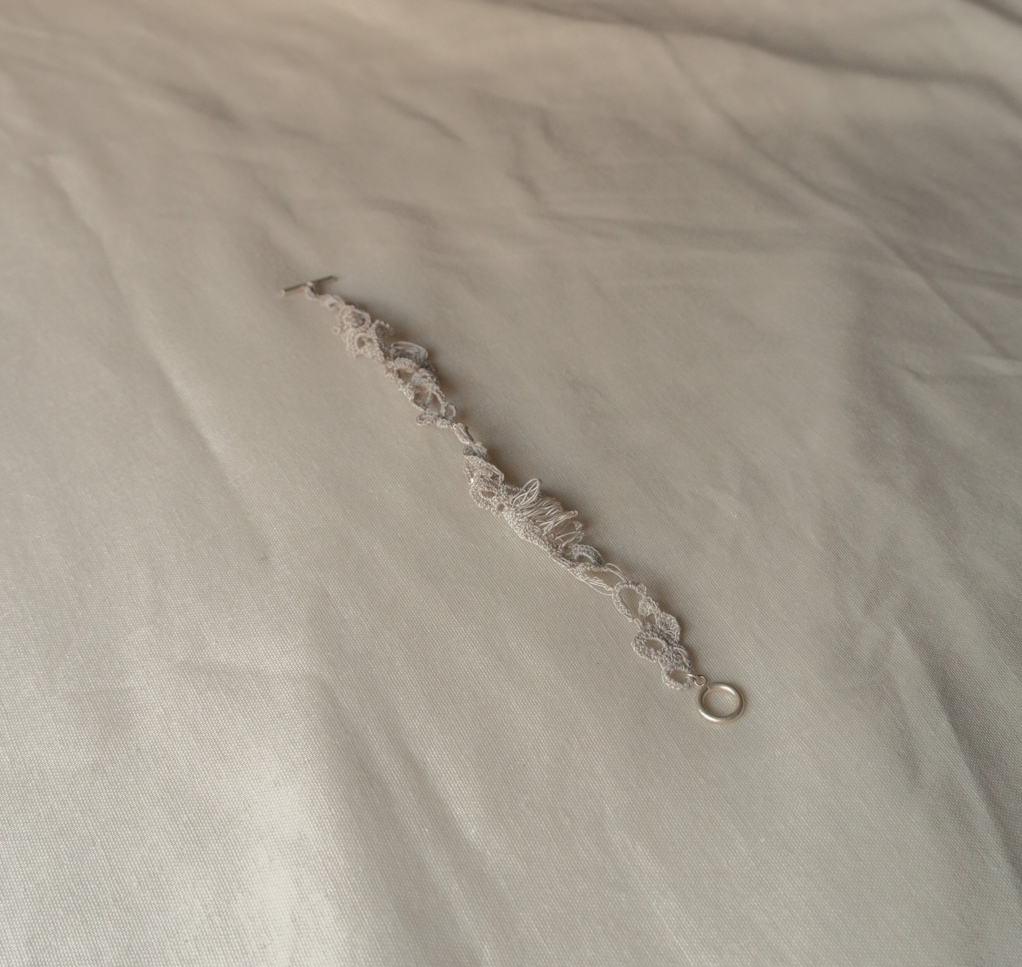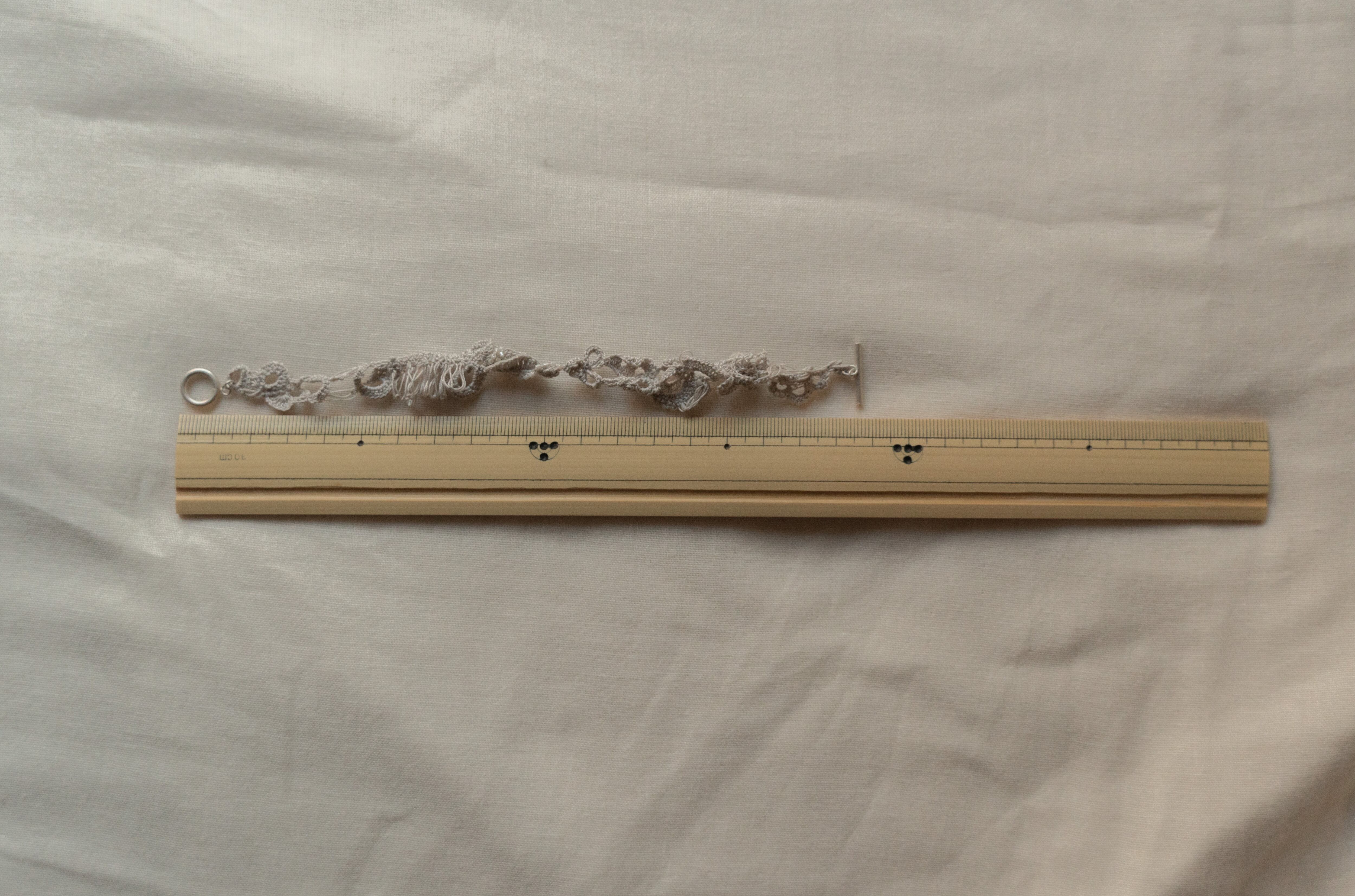 糸で作ったモチーフの中にも、金具を通すことができる部分がいくつかあります。ご自分の手首のサイズに合わせてお使いください。